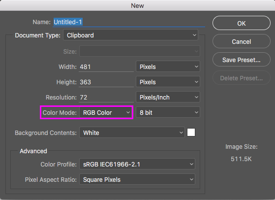 To get a better representation of how your final print will look, choose CMYK when creating a new file. Keep in mind, however, that an uncalibrated monitor may not match the finished print.