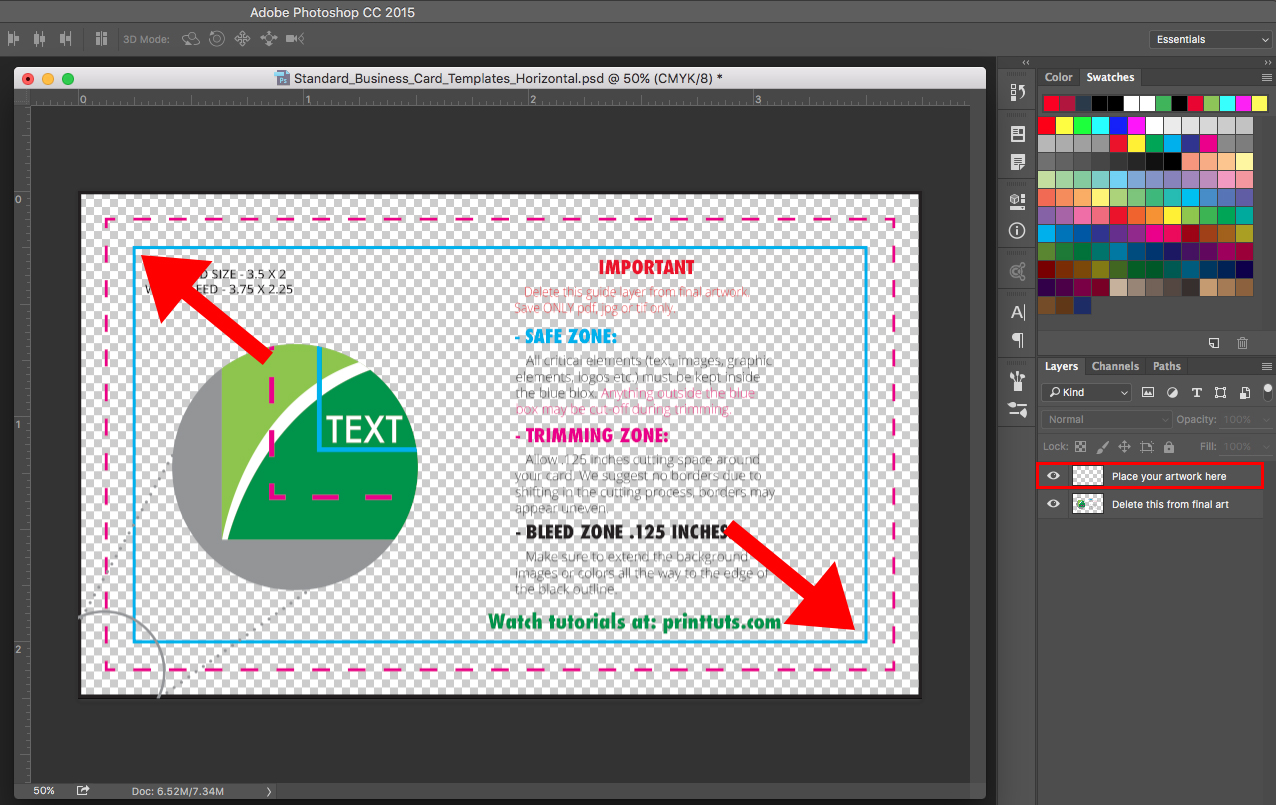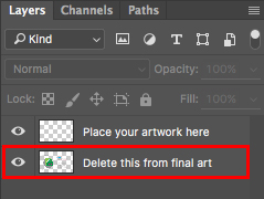 3. Open the psd file in Adobe Photoshop and follow the guides, create your artwork in the Place your artwork here layer, make sure that any artwork and details you don't want to get cut-off should stay inside the blue line (safe zone).