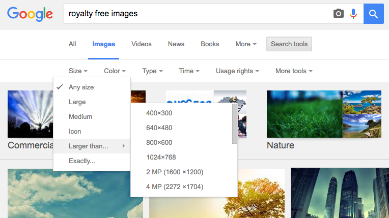1. Do a Google Image search, click the Search Tools button and then Size drop menu.
