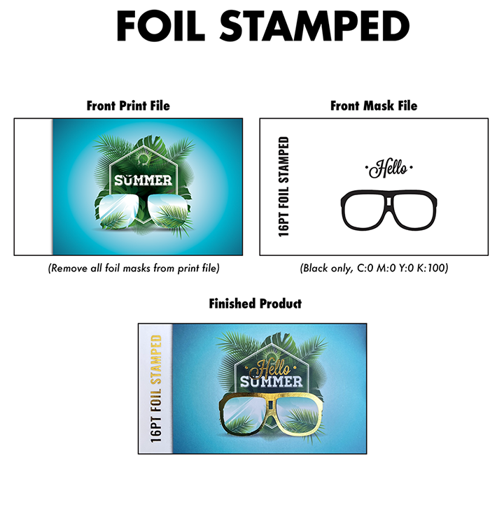 We can only do one type of foil per job, Gold, Copper or Silver. Foil job mask files are set up just like our Spot UV mask files. You must provide a separate Foil Mask File: Black in the areas you want the foil and white in the areas you do not want the foil. All black areas should be solid 100%K.