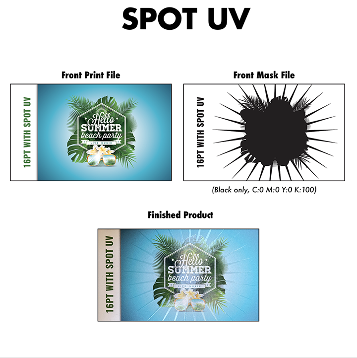 When creating a Spot UV job you must include a Spot UV Mask file along with the print File. The Spot UV Mask File is used to show where the UV coating needs to be applied.