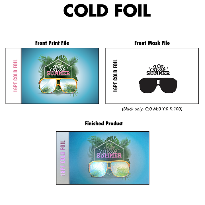 As shown above, the file on the top left is the normal CMYK print file. If you want the text and glasses to be foil, then your Foil mask file should look like the file on top the right. The white indicates no Cold Foil and black 100% K indicates where the Cold Foil will be applied. All artwork must be uploaded in separate files.