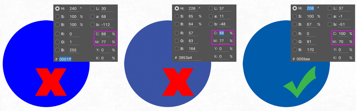 The higher resolution, the better! If you aren’t sure between two files, the larger file size is probably the safer choice. We support PDF, JPG’s, JPEGs, and PNG’s. Files should be in CMYK color mode. Images that are oversaturated, meaning they contain for than 250% total percentages of CMYK may print with unexpected results. Avoid using Photoshop's black value (C=75 M=68 Y=67 K=90) since it goes above the maximum ink coverage of 240% resulting in a muddy looking black when printed.