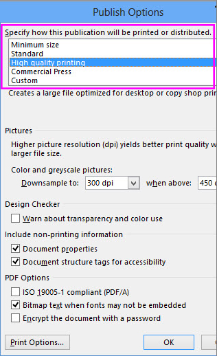 4. Click Options and for the publish option choose either High Quality Printing or Commercial Press, to make sure you’re sending us the best quality file possible