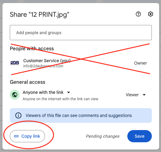 For Google Drive (and DROPBOX), please email us a link to your file from the GET LINK or GENERAL ACCESS areas as seen in the image below. Please do not add our email address as someone with "Access" to your file.