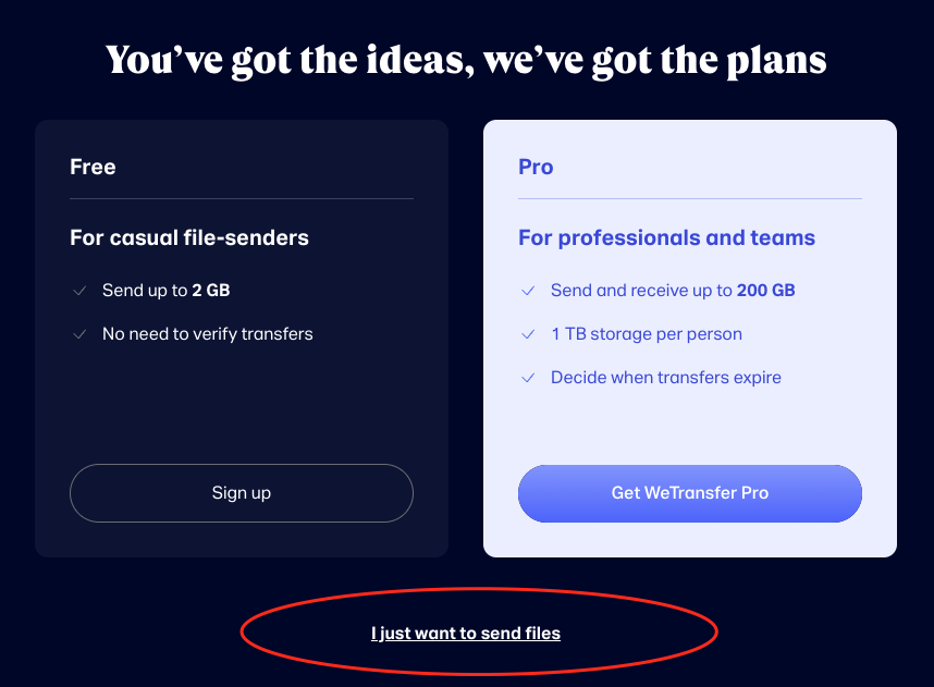 If you do not have Google Drive or Dropbox you may send your file using the same method with most other mail services or you may use Wetransfer.com You do not need an account to use Wetransfer.com simply click on I JUST WANT TO SEND FILES as seen in the image below.